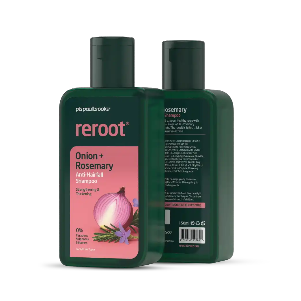 Reroot Anti-Hairfall Shampoo reduces hair fall and supports healthy regrowth for fuller, thicker hair. Powered by Onion Extract (Allium cepa), Rosemary Oil (Rosmarinus officinalis), and Panthenol (Vitamin B5), it energizes the scalp, strengthens roots, and helps hair feel stronger over time.